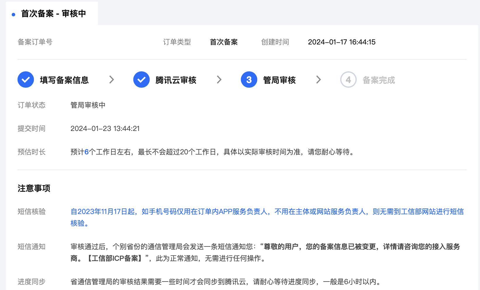提交审核时间到了01-23 ,管局于01-29审核备案完成
